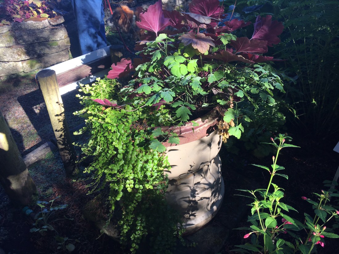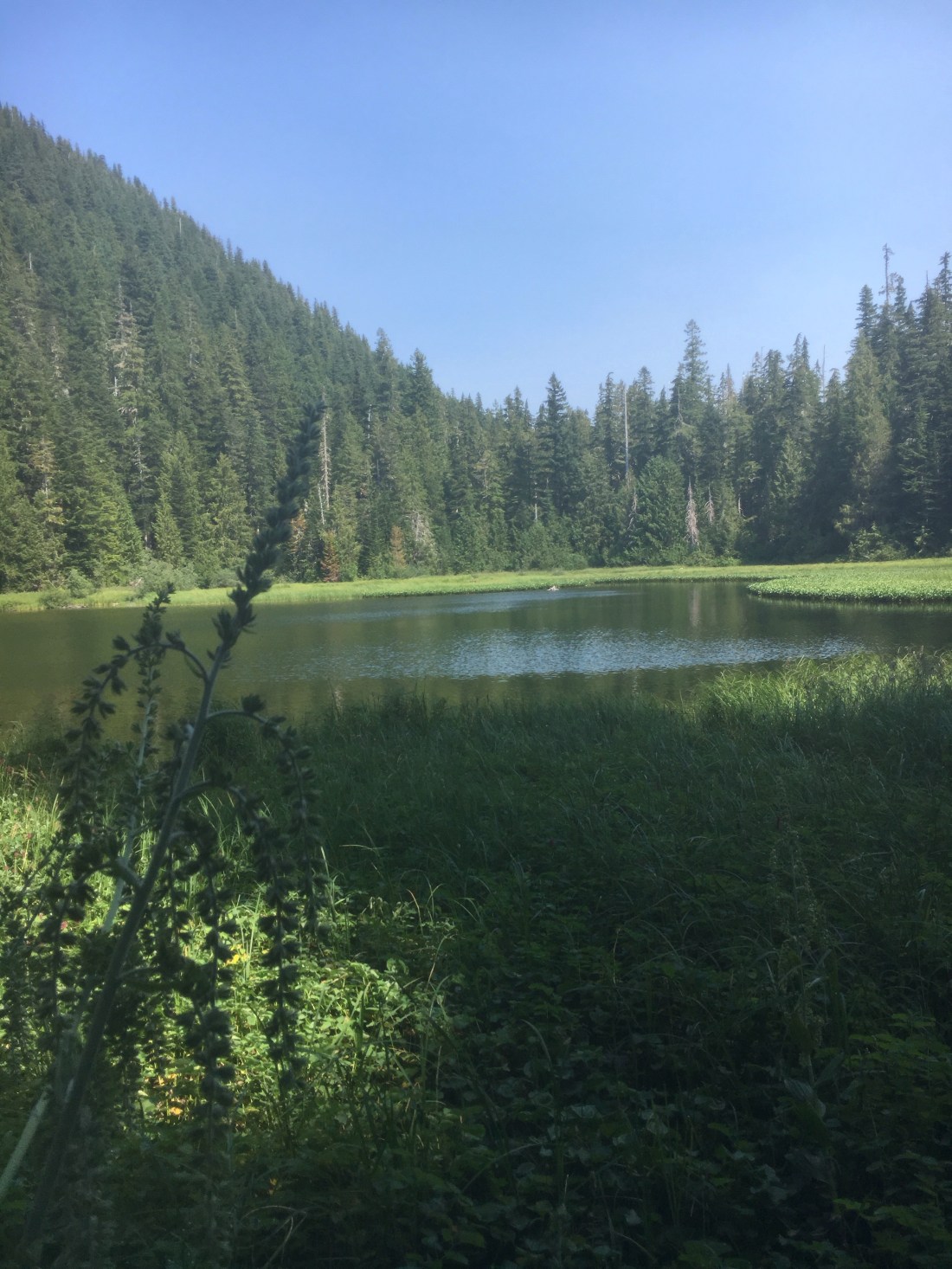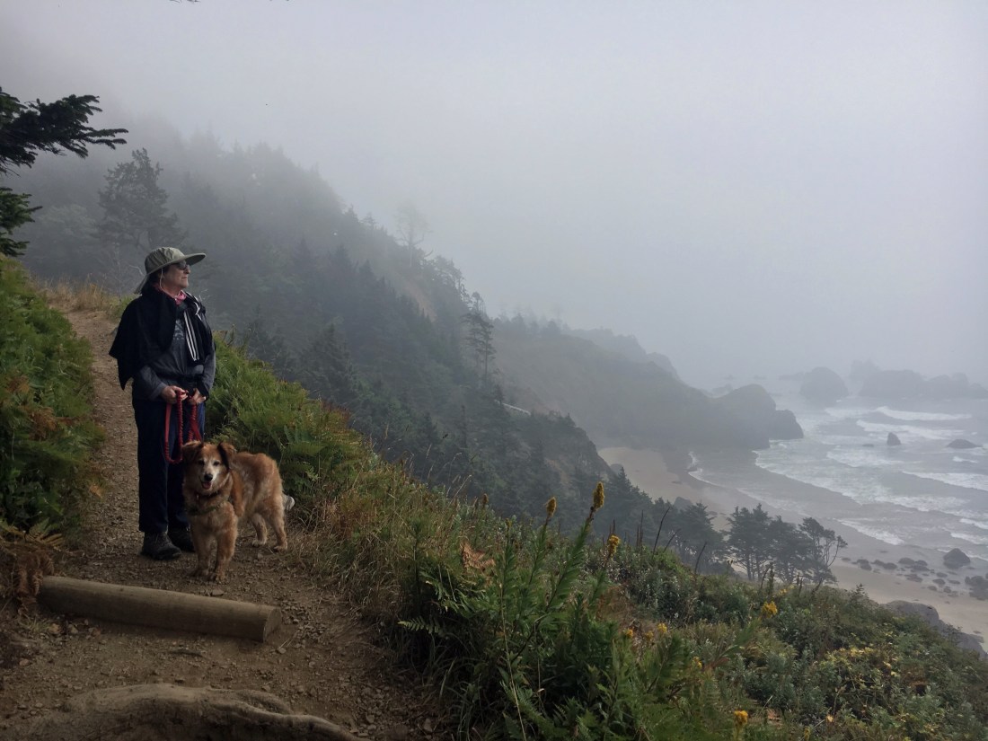 Yesterday in Newport we saw orcas lurking just past a rock where the seals had hauled out to rest. We watched for a while. Marco, under the bench, thought, “Big Whup.” He’d had a heap of frustration resisting the tame rabbits hopping around the Pleasant Valley RV Park. One couple, former Californians and park residents, get a 10 pound bag of carrots from Safeway every week to feed the rabbits.”$10 a week,” the husband told me with pride. So the place was overrun with bunnies, sleek gentle bunnies that didn’t scurry away from Marco. How unnatural.