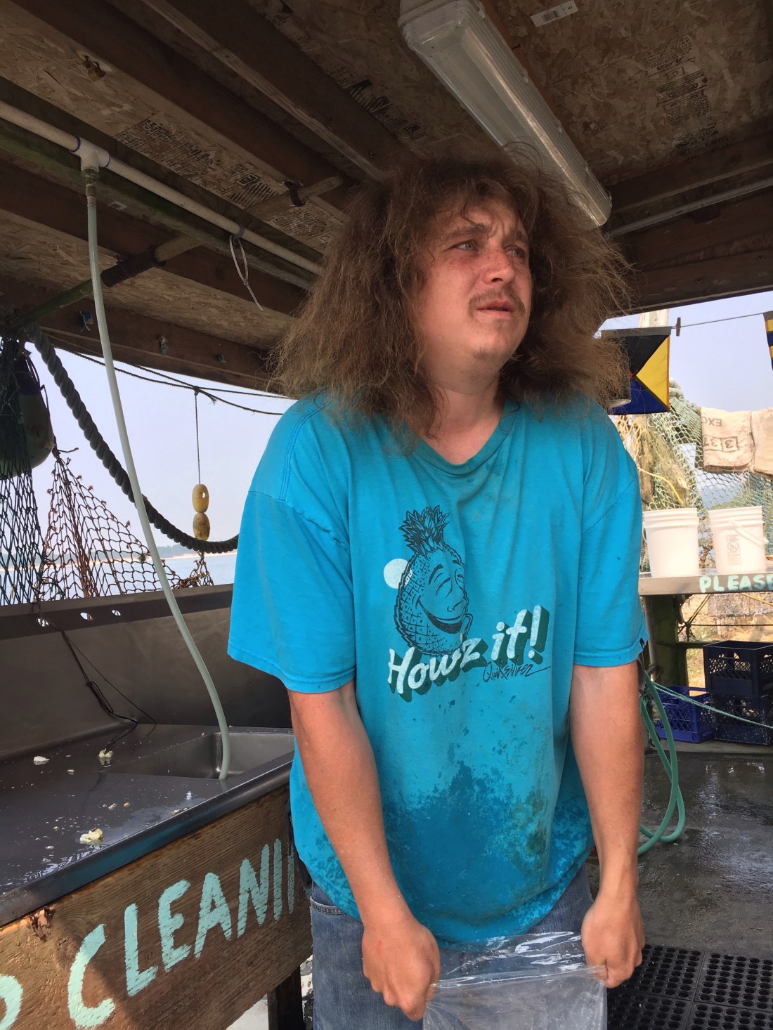 From a tank, I picked out a couple of live crabs which Landon the crab boiler weighed for me. He threw them into a net labeled M and told me to check back in 20 minutes. I paid the dock owner and brought Landon my receipt. He fished net M out and hosed down the crustaceans to cool them enough to handle. He gutted them for me. Using the pointy tip of a crab leg, he speared a crab heart and offered it to me with a flourish. Hm. I’m not in the habit of accepting organs from strangers. But Landon looked so proud, I could not disappoint him. Here’s Landon at work: