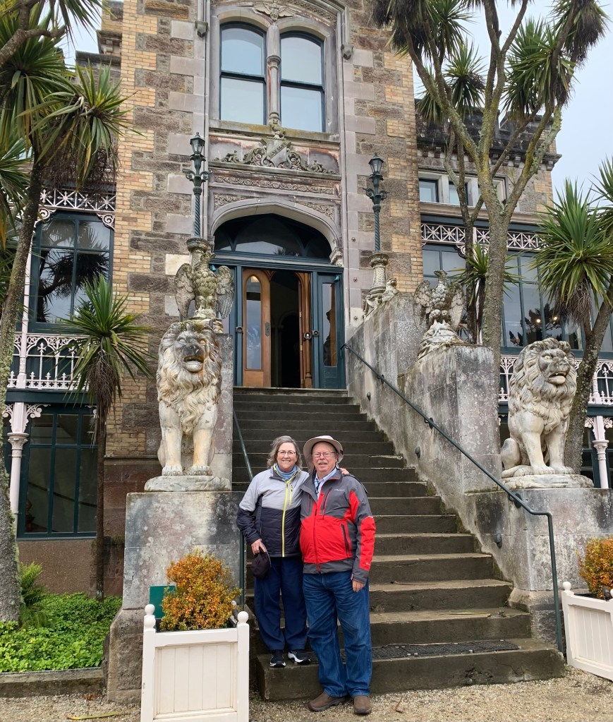 The main tourist attraction is Larnach Castle, costing hundreds of thousands of pounds, and mostly finished in 1871. Its coat of arms shows two Scottish wildcats rampant. Its motto is “Sans Peur.”  William Larnach enjoyed good fortune as a banker and MP when the Gold Rush of 1861 changed Otago from sleepy to raucous. He was a director of mines while the gold flowed. The entrepreneurial Mr. Larnach spared no expense on fine woodworking. He had six children with his first wife and married twice more after her death at age 38. But when his fortunes changed and the money dried up in 1898, he shot himself in the head in his office in Wellington.  He died intestate. The scandal behind his death is what Gregor would tell us that we couldn’t hear from the current castle owners. Based on rumors at the time, Larnach’s third wife Constance was having an affair with her stepson Douglas. After William’s death, Constance went home to England and had a child. The remaining five children, as Kate the eldest died in her twenties, were left house-rich and cash-poor. They held an estate sale to get rid of the furnishings and sold Larnach castle. Donald shot himself in the head twelve years after his father’s death, in 1910. Freud popularized the term “Oedipal Complex” in 1910 as well.