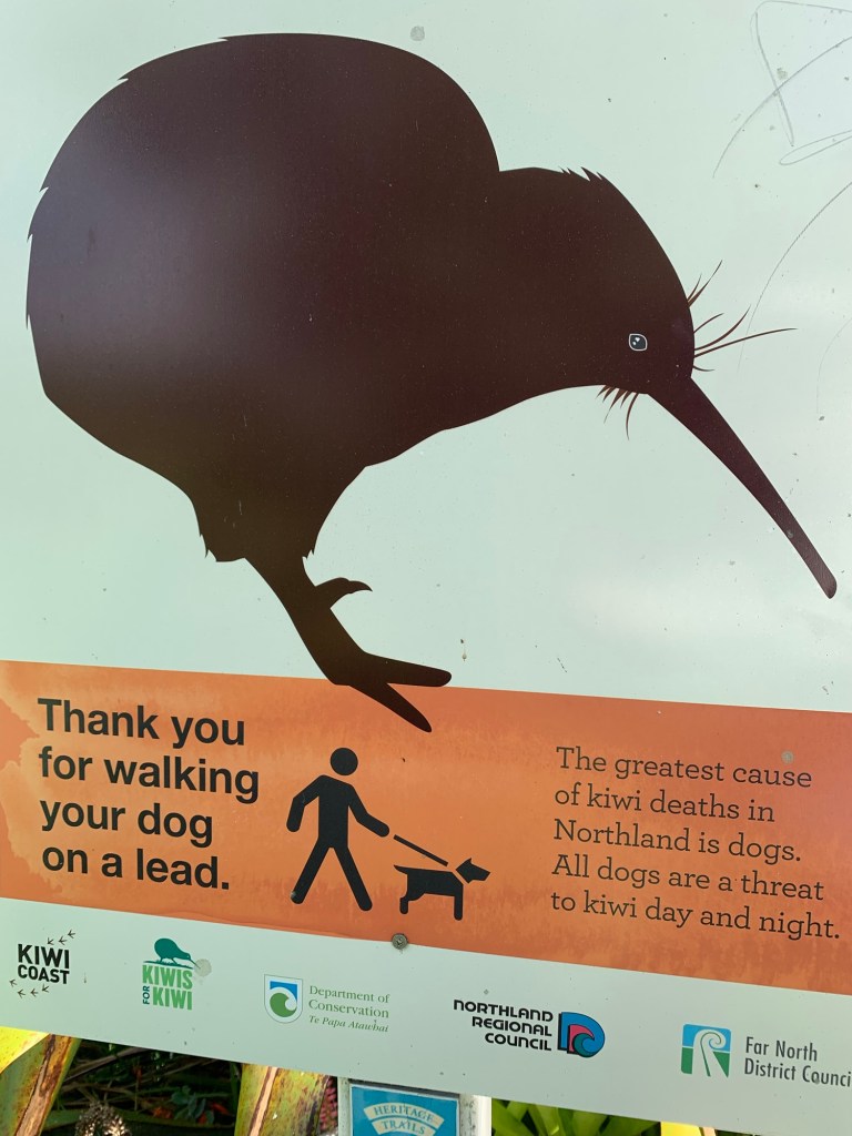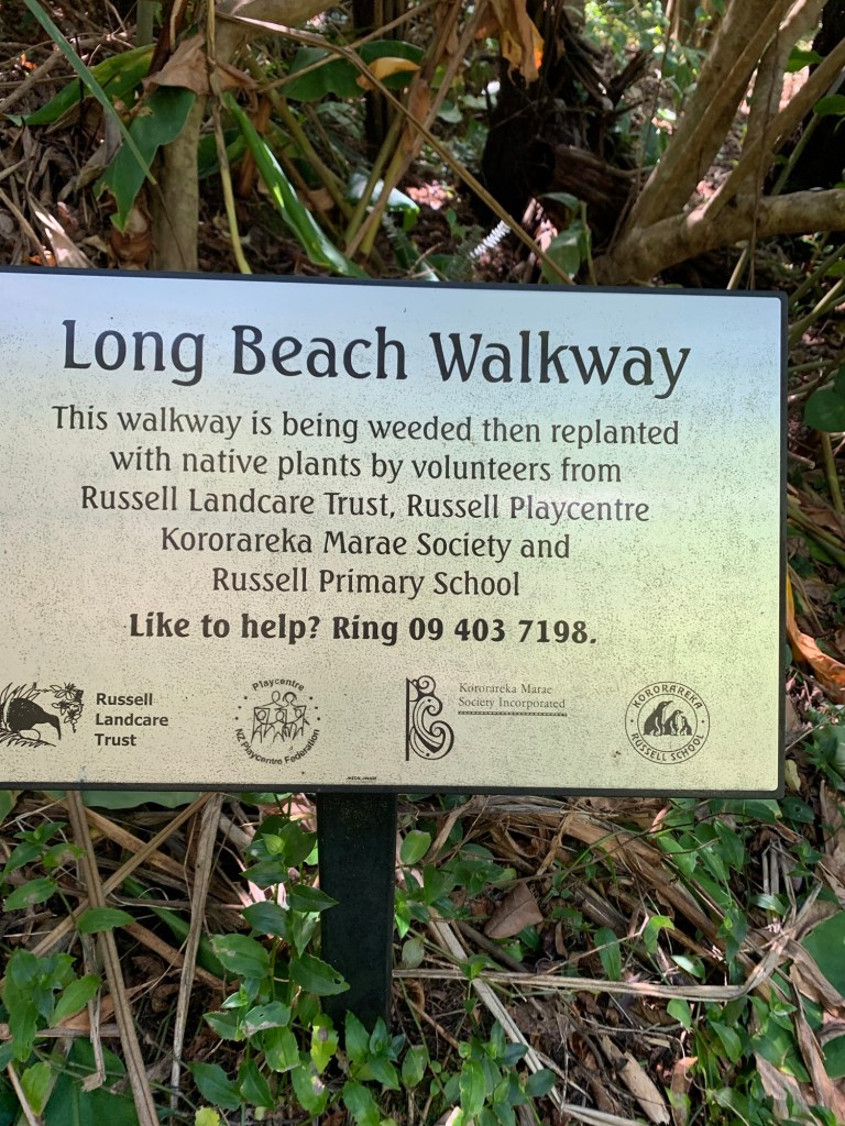 My first impression of Bay of Islands (BOI) came in the form of a multimillion dollar mega yacht gliding by our ship. It must have had a crew of ten to maintain and polish it. BOI seems like a quiet place for millionaires to lurk unobtrusively. There are dozens of uninhabited volcanic islands offering secluded coves cropping up out of the turquoise Pacific. The Treaty of Waitangi (1840) was signed here, between the Māori King and the British Queen. We anchored among the islands and tendered to the dock at Paihia. Then we ferried across the bay to the town of Russell. The climate and vegetation seemed tropical like Hawaii. From the jolly Customs official in Paihia we learned that one side of the Bay, Paihia, was colonized by missionaries and the other side, Russell, by rough seamen, escaped convicts, and pirates: heaven and hell. Russell was once called the “Hell Hole of the Pacific.” Now it appears to be a laid-back boating Mecca. There’s nothing to do here except drink. We walked 2 km to Long Beach.  I heard but did not see a dolphin. I saw but did not hear a sooty shearwater. I swam off the beach and enjoyed the quiet vibe. The public toilets at the beach were clean and had changing tables. A poster informed us that NZ marine mammals get 300 meters of distance from human passersby, whereas in our Monterey Bay the marine mammals only get 100 yards. We admired a cute Labradoodle, who didn’t want any distance from passersby. We chatted with Australian golfers on holiday, looking for something to do. And then we’d had enough of Bay of Islands.