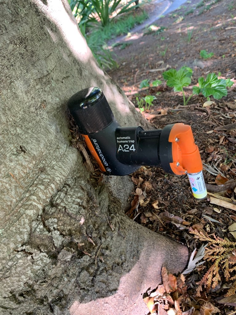 As a form of local pride, Kiwis have been educating me about their unique wonders. Stop calling it flax, it’s Phormium or Harakeke. No, that’s not a lizard, it’s a Sphenodon or tuatara. And do not confuse the New Zealand brushtail possum, Trichosurus vulpecula, with its North American country cousin Opossum, Didelphus. Let’s focus on the brushtail possum, the most despised predator on the Department of Conservation (DOC) invasive species list. Their population is estimated to be 70 million. The possum is the scourge of farmers, orchardists, and conservationists. The brushtail possum was introduced to NZ by opportunistic trappers seeking to replicate the material bounty of beavers and minks. Unfortunately for the environment, the possums said thanks and be seeing ya and ate trees and bird eggs and bred like rabbits, no, like possums. They ravenously chow down on only the tastiest buds of the tree, leaving it unable to grow, and then move on to the next tree without finishing up the whole tree. The DOC employs full time possum killers, but what has worked best against the possums is higher tech. The DOC used a crop duster to airdrop poisoned cereal bait in possum-infested areas. That did away with many possums, but the by-kill included birds and household pets. Now we see little poison houses and humane electric current zapper traps attached to trees.