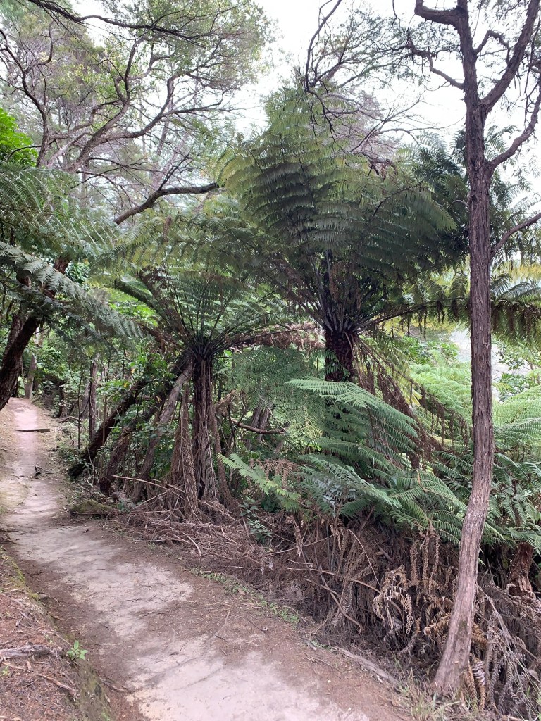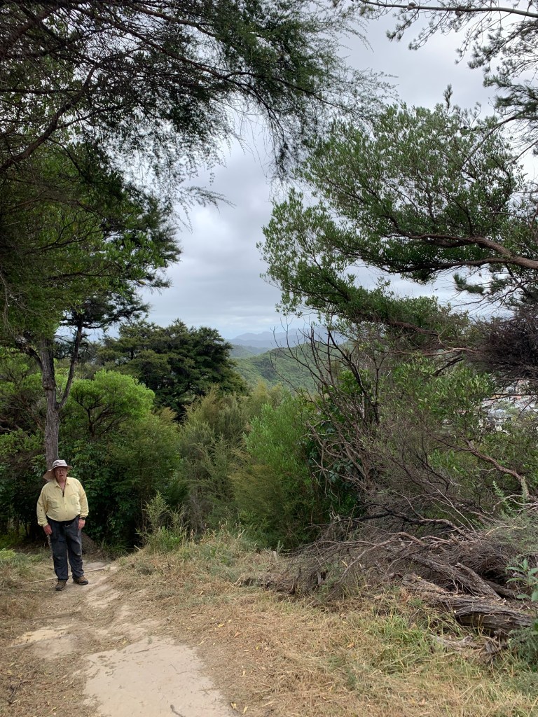 So we sauntered up the Tirohanga Track. We climbed switchbacks in the clay soil to a lookout, then looped around on the other side of the hill to walk back through town. We met Steve, a park ranger, who maintains the track. The track reminded me of Saint Joseph’s Hill south of Los Gatos but with tree ferns and palms. We saw sporty runner girls in sports bras and shorts, locals with thirsty doggies, and other visitors. Wildlife sightings: two Wēka, large flightless birds. The clerk in the Environment Centre shop scoffed and said they were pesty natives who ate endangered species and used their sharp beaks to spring the traps set for rats and possums. The Picton Dawn Chorus, a nonprofit, protects the birds, but not the Wēka.